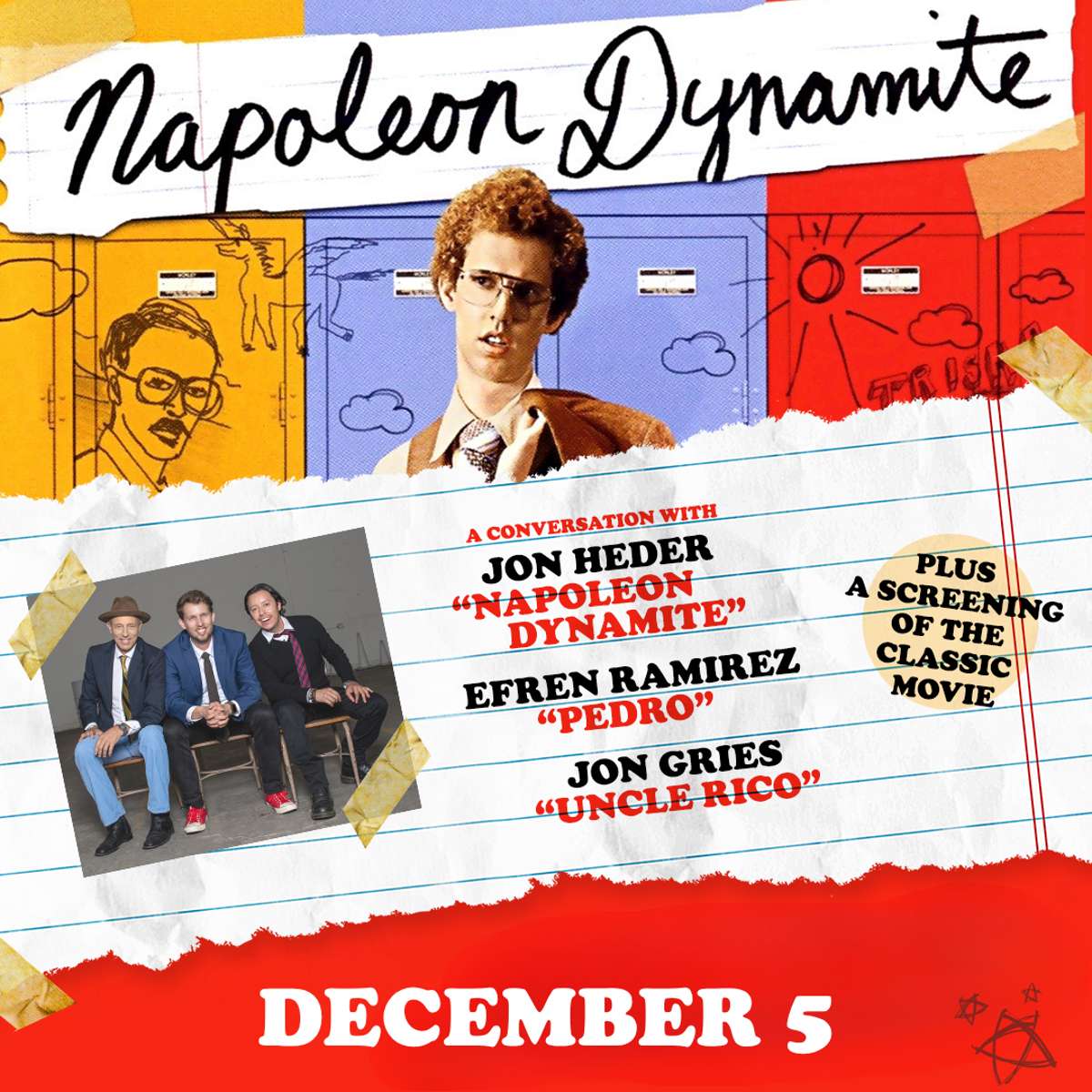 This unique evening includes a full screening of Napoleon Dynamite followed by a lively, freewheeling, interactive experience, with fan-favorite cast members; Jon Heder (Napoleon Dynamite), Jon Gries (Uncle Rico) and Efren Ramirez (Pedro).
